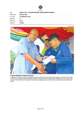 Title BERITA FOTO - PROGRAM WELDING DEVELOPMENT PROGRAM Media Name Investor Daily Pub. Date 27 September 2019 Page/URL 13 Media Type Koran Sentiment Positive Page 6 of 49.
