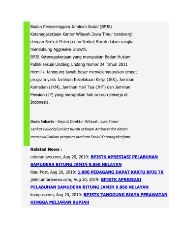 jatim.antaranews.com, Aug 20, 2019: BPJSTK APRESIASI