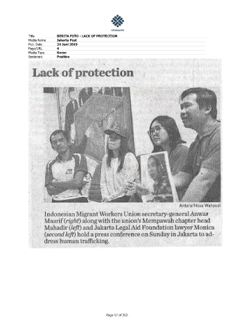 Title BERITA FOTO - LACK OF PROTECTION Media Name Jakarta Post Pub. Date 24 Juni 2019 Page/URL 4 Media Type Koran Sentiment Positive Page 17 of 352.
