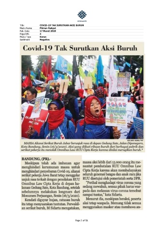 Title COVID-19 TAK SURUTKAN AKSI BURUH Media Name Pikiran Rakyat Pub. Date 17 Maret 2020 Page/URL 4 Media Type Koran Sentiment Negative Page 2 of 58.