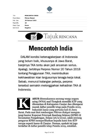 Title MENCONTOH INDIA Media Name Pikiran Rakyat Pub. Date 28 Februari 2019 Page/URL 18 Media Type Koran Sentiment Negative Page 22 of 102.