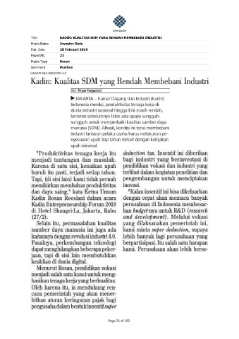 Title KADIN: KUALITAS SDM YANG RENDAH MEMBEBANI INDUSTRI Media Name Investor Daily Pub. Date 28 Februari 2019 Page/URL 21 Media Type Koran Sentiment Positive Page 25 of 102.