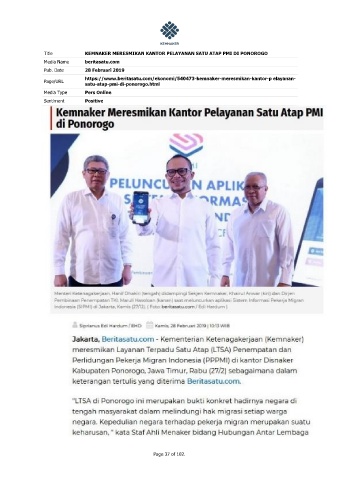 Title KEMNAKER MERESMIKAN KANTOR PELAYANAN SATU ATAP PMI DI PONOROGO
