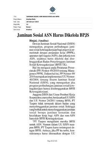Title JAMINAN SOSIAL ASN HARUS DIKELOLA BPJS Media Name Analisa Daily Pub. Date 28 Februari 2019 Page/URL 12 Media Type Koran Sentiment Positive Page 40 of 102.