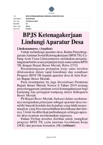 Title BPJS KETENAGAKERJAAN LINDUNGI APARATUR DESA Media Name Analisa Daily Pub. Date 28 Februari 2019 Page/URL 22 Media Type Koran Sentiment Positive Page 45 of 102.