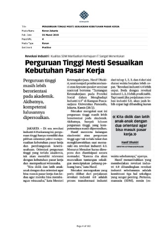 Title PERGURUAN TINGGI MESTI SESUAIKAN KEBUTUHAN PASAR KERJA Media Name Koran Jakarta Pub. Date 01 Maret 2019 Page/URL 4 Media Type Koran Sentiment Positive Page 4 of 102.