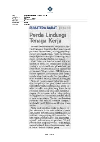 Title PERDA LINDUNGI TENAGA KERJA Media Name Indopos Pub. Date 08 Agustus 2019 Page/URL 6 Media Type Koran Sentiment Positive Page 22 of 156.