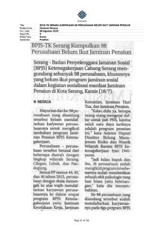 Title BPJS-TK SERANG KUMPULKAN 98 PERUSAHAAN BELUM IKUT JAMINAN PENSIUN Media Name Ekonomi Neraca Pub. Date 08 Agustus 2019 Page/URL 9 Media Type Koran Sentiment Positive Page 31 of 156.