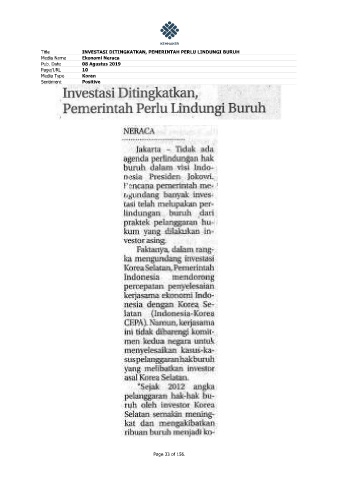 Title INVESTASI DITINGKATKAN, PEMERINTAH PERLU LINDUNGI BURUH Media Name Ekonomi Neraca Pub. Date 08 Agustus 2019 Page/URL 10 Media Type Koran Sentiment Positive Page 33 of 156.