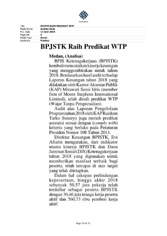 Title BPJSTK RAIH PREDIKAT WTP Media Name Analisa Daily Pub. Date 12 Juni 2019 Page/URL 3 Media Type Koran Sentiment Positive Page 24 of 73.