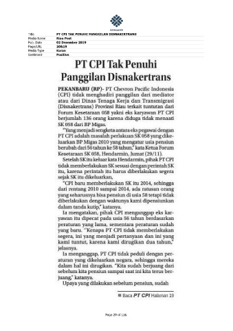 Title PT CPI TAK PENUHI PANGGILAN DISNAKERTRANS Media Name Riau Post Pub. Date 02 Desember 2019 Page/URL 20&19 Media Type Koran Sentiment Positive Page 29 of 116.