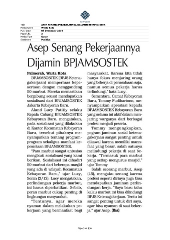 Title ASEP SENANG PEKERJAANNYA DIJAMIN BPJAMSOSTEK Media Name Warta Kota Pub. Date 03 Desember 2019 Page/URL 2 Media Type Koran Sentiment Positive Page 3 of 116.