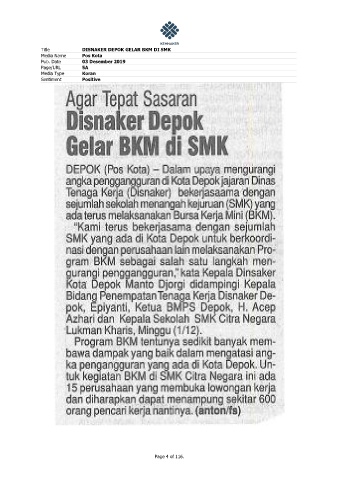 Title DISNAKER DEPOK GELAR BKM DI SMK Media Name Pos Kota Pub. Date 03 Desember 2019 Page/URL 5A Media Type Koran Sentiment Positive Page 4 of 116.