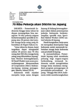 Title 70 RIBU PEKERJA AKAN DIKIRIM KE JEPANG Media Name Koran Jakarta Pub. Date 26 Juni 2019 Page/URL 4 Media Type Koran Sentiment Positive Page 15 of 185.