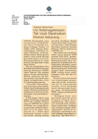 Title UU KETENAGAKERJAAN TAK USAH DIPAKSAKAN DIREVISI SEKARANG... Media Name Rakyat Merdeka Pub. Date 26 Juni 2019 Page/URL 11 Media Type Koran Sentiment Negative Page 17 of 185.