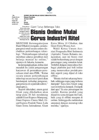 Title BISNIS ONLINE MULAI GERUS INDUSTRI RITEL Media Name Rakyat Merdeka Pub. Date 26 Juni 2019 Page/URL 15 Media Type Koran Sentiment Positive Page 19 of 185.