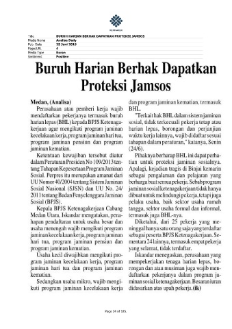 Title BURUH HARIAN BERHAK DAPATKAN PROTEKSI JAMSOS Media Name Analisa Daily Pub. Date 25 Juni 2019 Page/URL 4 Media Type Koran Sentiment Positive Page 54 of 185.