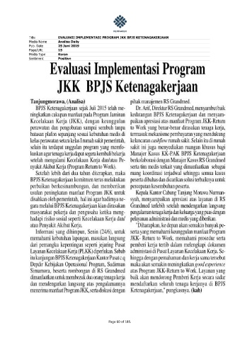 Title EVALUASI IMPLEMENTASI PROGRAM JKK BPJS KETENAGAKERJAAN Media Name Analisa Daily Pub. Date 25 Juni 2019 Page/URL 15 Media Type Koran Sentiment Positive Page 60 of 185.