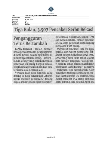 Title TIGA BULAN, 3.507 PENCAKER SERBU BEKASI Media Name Indopos Pub. Date 02 Juli 2019 Page/URL 12 Media Type Koran Sentiment Positive Page 34 of 95.