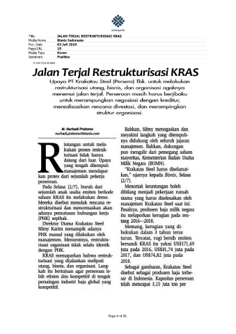 Title JALAN TERJAL RESTRUKTURISASI KRAS Media Name Bisnis Indonesia Pub. Date 03 Juli 2019 Page/URL 15 Media Type Koran Sentiment Positive Page 4 of 95.