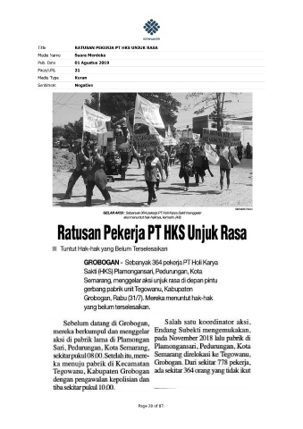 Title RATUSAN PEKERJA PT HKS UNJUK RASA Media Name Suara Merdeka Pub. Date 01 Agustus 2019 Page/URL 21 Media Type Koran Sentiment Negative Page 28 of 87.