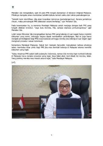 Menaker Ida mengatakan, saat ini para PMI tengah diamankan di tahanan imigrasi Malaysia.