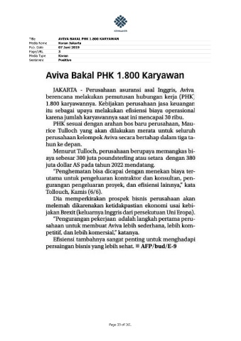 Title AVIVA BAKAL PHK 1.800 KARYAWAN Media Name Koran Jakarta Pub. Date 07 Juni 2019 Page/URL 3 Media Type Koran Sentiment Positive Page 33 of 161.