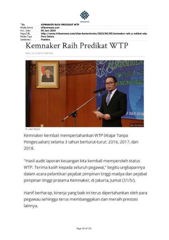 Title KEMNAKER RAIH PREDIKAT WTP Media Name tribunnews.com Pub. Date 05 Juni 2019 Page/URL http://www.tribunnews.com/kilas-kementerian/2019/06/05/kemnaker-raih-p redikat-wtp Media Type Pers Online Sentiment Positive Page 43 of 161.