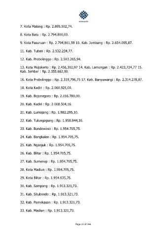 9. Kota Pasuruan : Rp. 2.794,801,59 10. Kab. Jombang : Rp. 2.654.095,87.