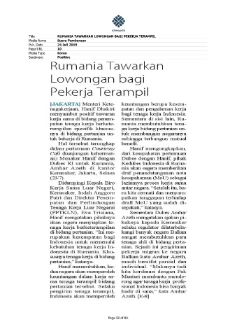 Title RUMANIA TAWARKAN LOWONGAN BAGI PEKERJA TERAMPIL Media Name Suara Pembaruan Pub. Date 24 Juli 2019 Page/URL 10 Media Type Koran Sentiment Positive Page 58 of 80.