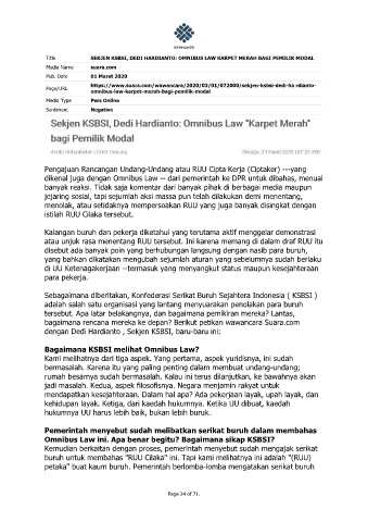 Title SEKJEN KSBSI, DEDI HARDIANTO: OMNIBUS LAW KARPET MERAH BAGI PEMILIK MODAL