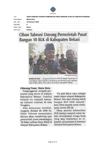 Title OBON TABRONI DORONG PEMERINTAH PUSAT BANGUN 10 BLK DI KABUPATEN BEKASI Media Name Warta Kota Pub. Date 29 Februari 2020 Page/URL 6 Media Type Koran Sentiment Positive Page 40 of 71.