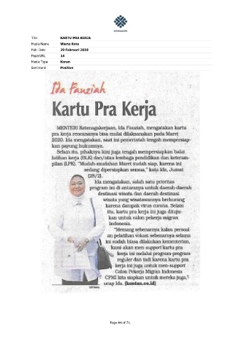 Title KARTU PRA KERJA Media Name Warta Kota Pub. Date 29 Februari 2020 Page/URL 14 Media Type Koran Sentiment Positive Page 44 of 71.