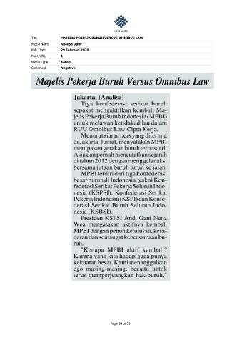 Title MAJELIS PEKERJA BURUH VERSUS OMNIBUS LAW Media Name Analisa Daily Pub. Date 29 Februari 2020 Page/URL 1 Media Type Koran Sentiment Negative Page 54 of 71.