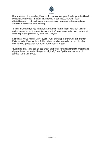 Dalam kesempatan tersebut, Menaker Ida menyambut positif hadirnya vokasi kreatif