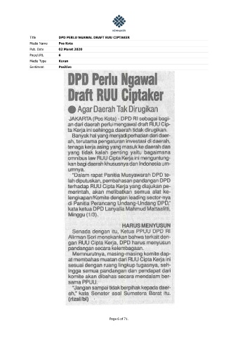 Title DPD PERLU NGAWAL DRAFT RUU CIPTAKER Media Name Pos Kota Pub. Date 02 Maret 2020 Page/URL 6 Media Type Koran Sentiment Positive Page 6 of 71.