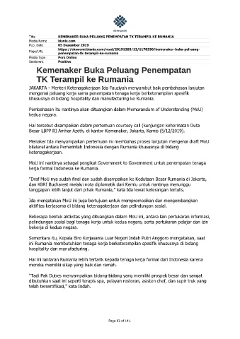 Title KEMENAKER BUKA PELUANG PENEMPATAN TK TERAMPIL KE RUMANIA