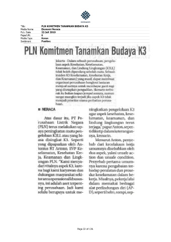 Title PLN KOMITMEN TANAMKAN BUDAYA K3 Media Name Ekonomi Neraca Pub. Date 23 Juli 2019 Page/URL 6 Media Type Koran Sentiment Positive Page 32 of 139.
