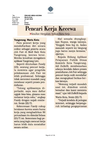 Title PENCARI KERJA KECEWA Media Name Warta Kota Pub. Date 23 Juli 2019 Page/URL 6 Media Type Koran Sentiment Positive Page 41 of 139.