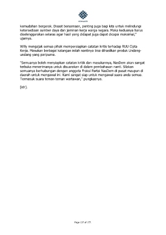 Willy mengajak semua pihak mempersiapkan catatan kritis terhadap RUU Cipta