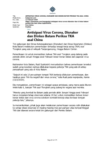 Title ANTISIPASI VIRUS CORONA, DISNAKER DAN DINKES BATAM PERIKSA TKA ASAL CHINA