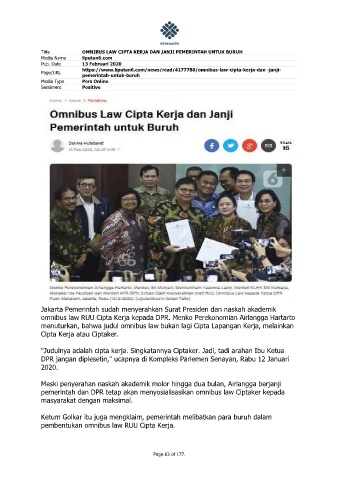 omnibus law RUU Cipta Kerja kepada DPR. Menko Perekonomian Airlangga Hartarto