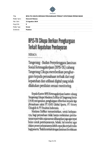 Title BPJS-TK CIKUPA BERIKAN PENGHARGAAN TERKAIT KEPATUHAN PEMBAYARAN Media Name Ekonomi Neraca Pub. Date 23 Agustus 2019 Page/URL 9 Media Type Koran Sentiment Positive Page 8 of 8.