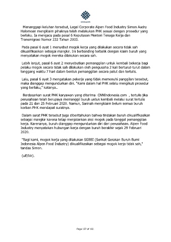 kerja. Karenanya, buruh dianggap mengundurkan diri dari perusahaan. Alpen Food