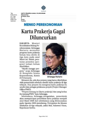 Title KARTU PRAKERJA GAGAL DILUNCURKAN Media Name Malang Post Pub. Date 06 Maret 2020 Page/URL 5 Media Type Koran Sentiment Positive Page 169 of 192.