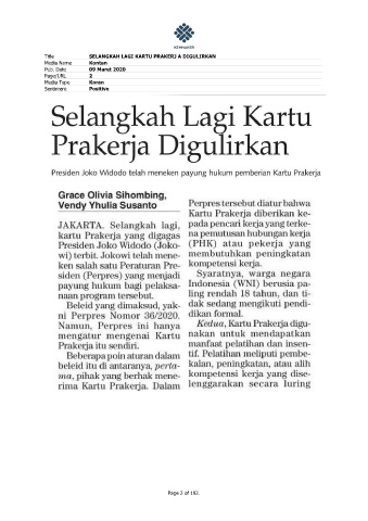 Title SELANGKAH LAGI KARTU PRAKERJ A DIGULIRKAN Media Name Kontan Pub. Date 09 Maret 2020 Page/URL 2 Media Type Koran Sentiment Positive Page 2 of 192.