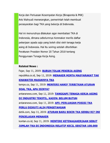 antaranews.com, Sep 11, 2019: TANGGAPI TENAGA KERJA ASING