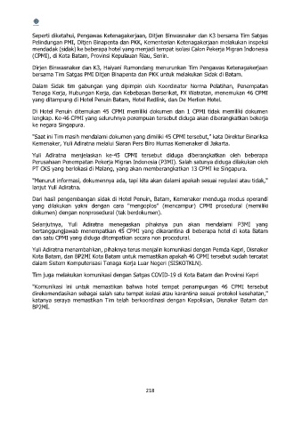 bertanggungjawab menempatkan 45 CPMI yang dikarantina di beberapa hotel di kota Batam