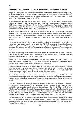 bertanggungjawab menempatkan 45 CPMI yang dikarantina di beberapa hotel di kota Batam