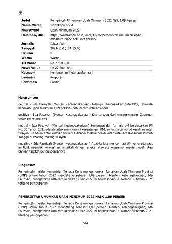(UMP) untuk tahun 2022 mendatang sebesar 1,09 persen. Menteri Ketenagakerjaan, Ida